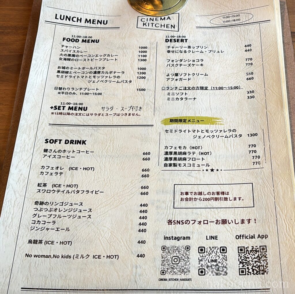 メニュー表です✨11時〜15時まではランチセットがありお得な内容となっています!車を利用された方は駐車券提示で200円引きとなりますので、お忘れなく🎫