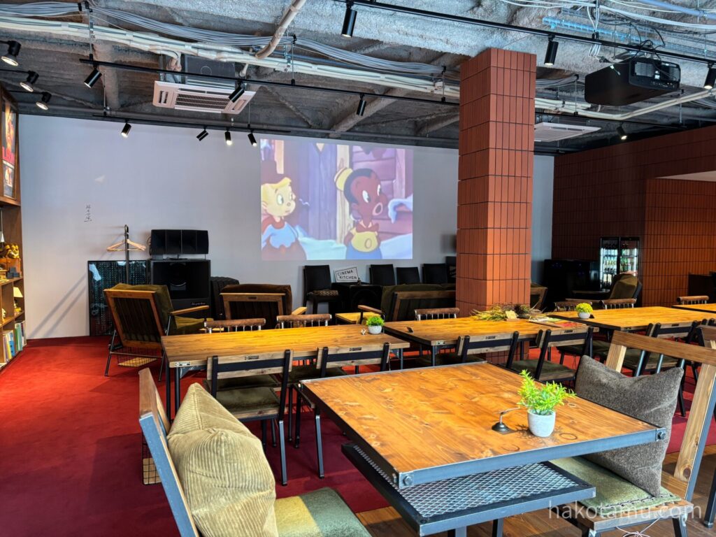 奥にはスクリーンがあり、無音で映画が流れていました!