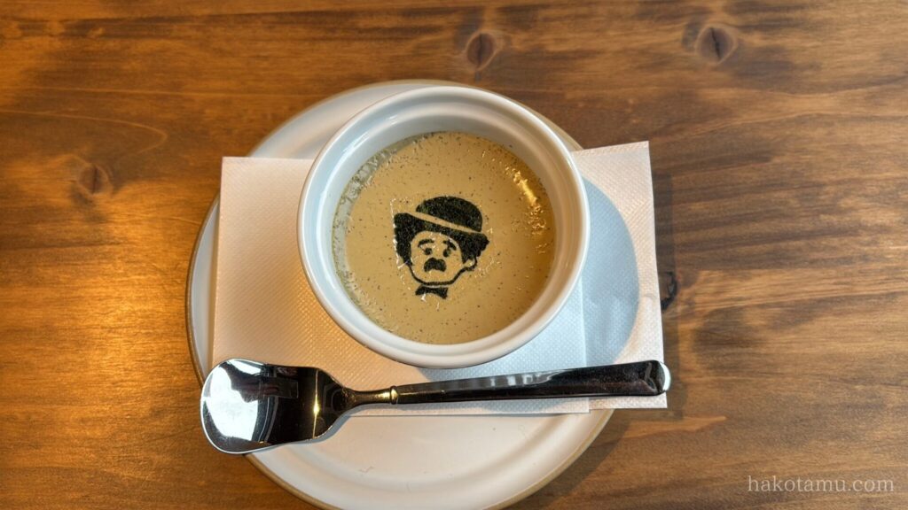 とぼけた顔の喜劇王チャーリーチャップリンが印刷されたプリンに一目惚れし、追加でチャーリー茶ップリンをお願いしました🍮かわいいですね〜🤭ねっとり濃厚なお茶のプリンでした!