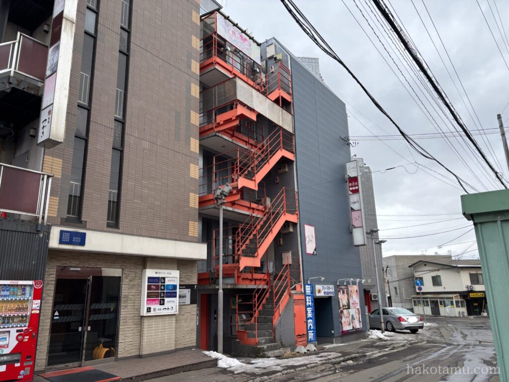 場所は函館の繁華街五稜郭エリア⭐️夜はとても賑やかですが日中はひと気がなく、とても静かでした!夢恋座さんは、赤い階段が目を惹くこちらのビル4階にあります🟥なんだか、これを見た時ワクワクした筆者です👀