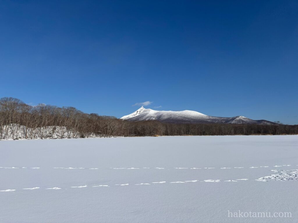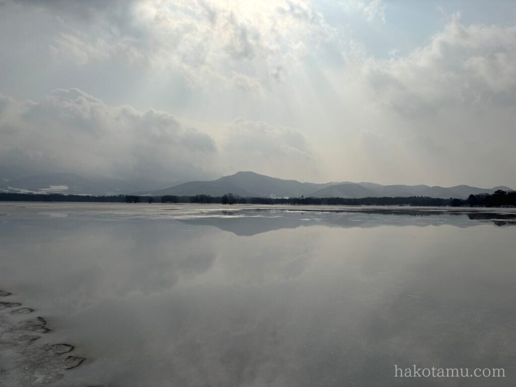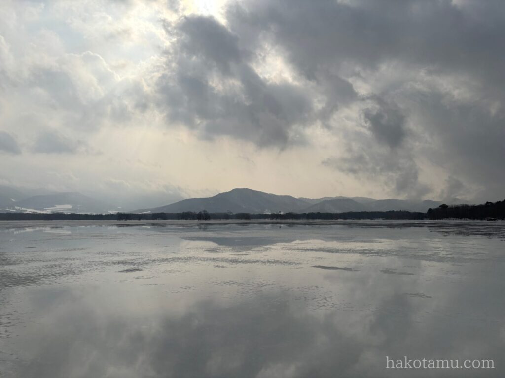 うわぁ〜!何度見てもめちゃくちゃ綺麗です✨氷➕水のはった湖面に空と山が反射しているのがお分かりでしょうか?まさに道南のウユニ塩湖!天気とタイミングに恵まれて、出会えたこの景色にとても感動した筆者でした😊