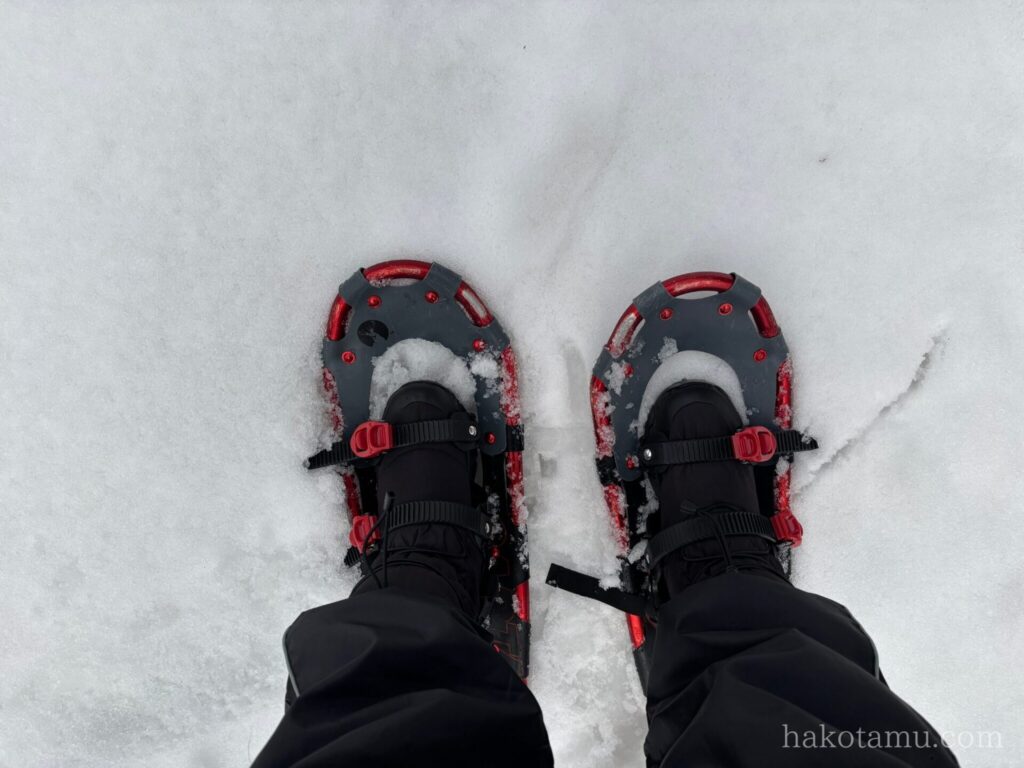 さて、スノーシューを装着し探索です!写真のように緩まないようにキツめに装着し、いざ出陣💪