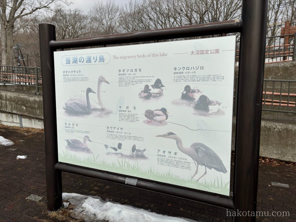 この湿地で見られる渡り鳥の説明パネルです。お馴染みのカルガモからオオハクチョウまで来るようです。