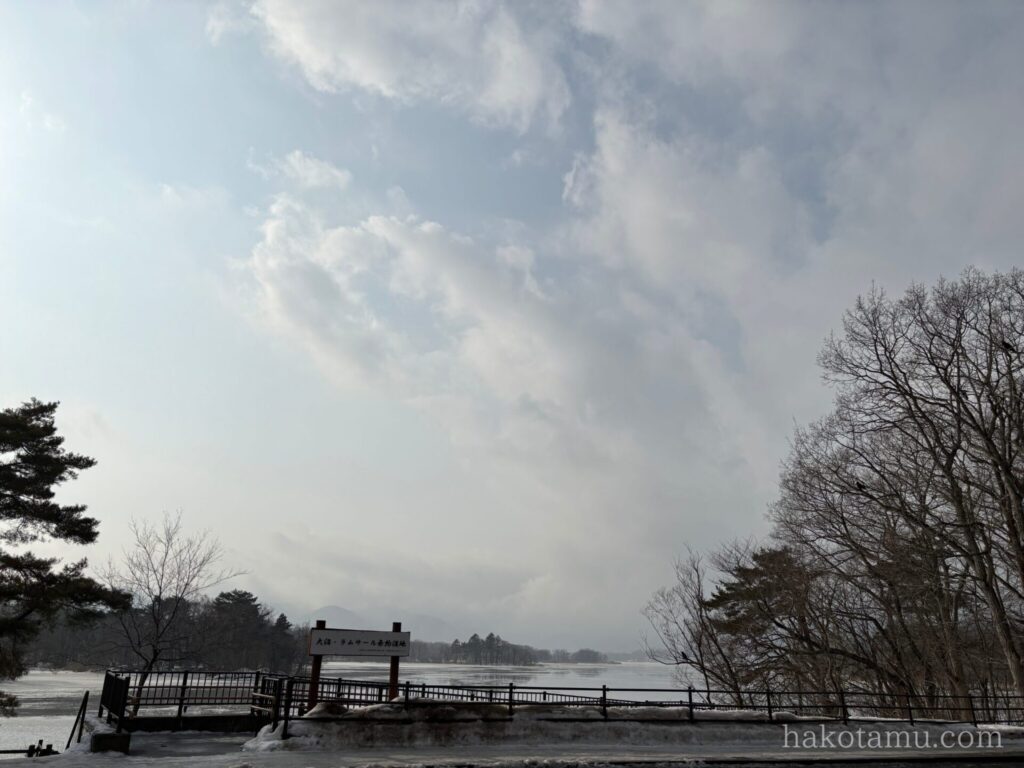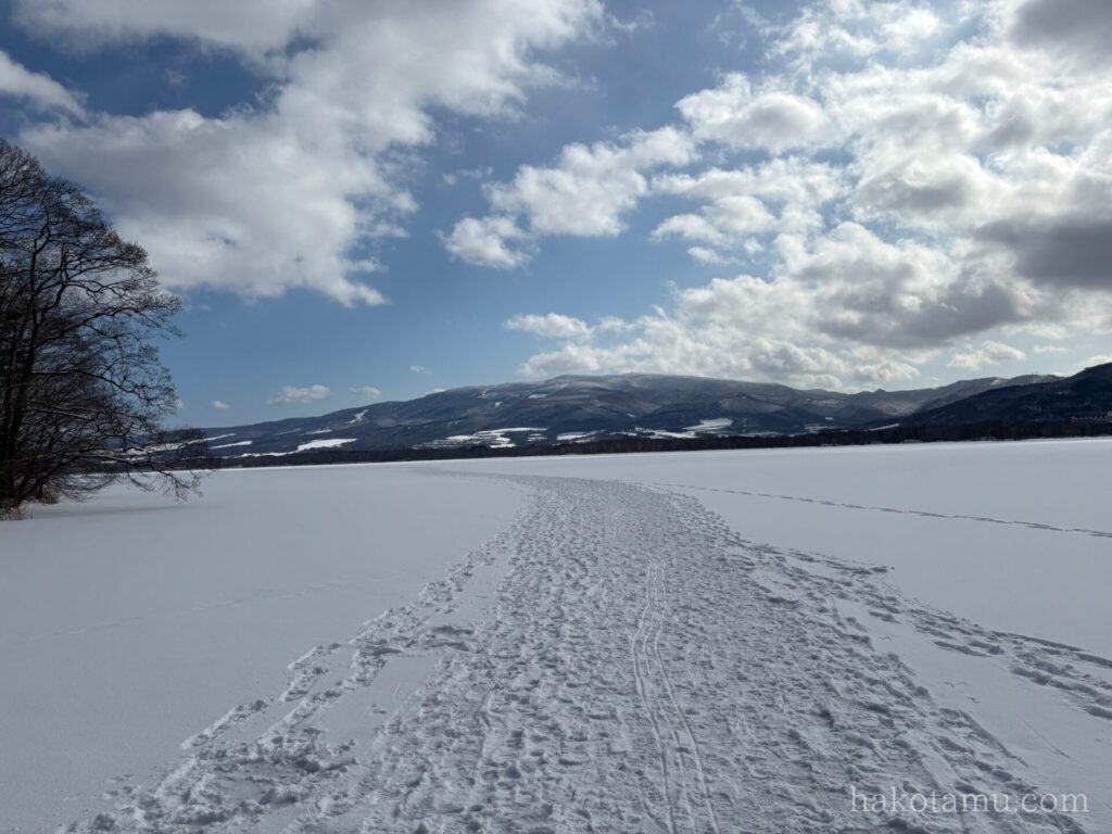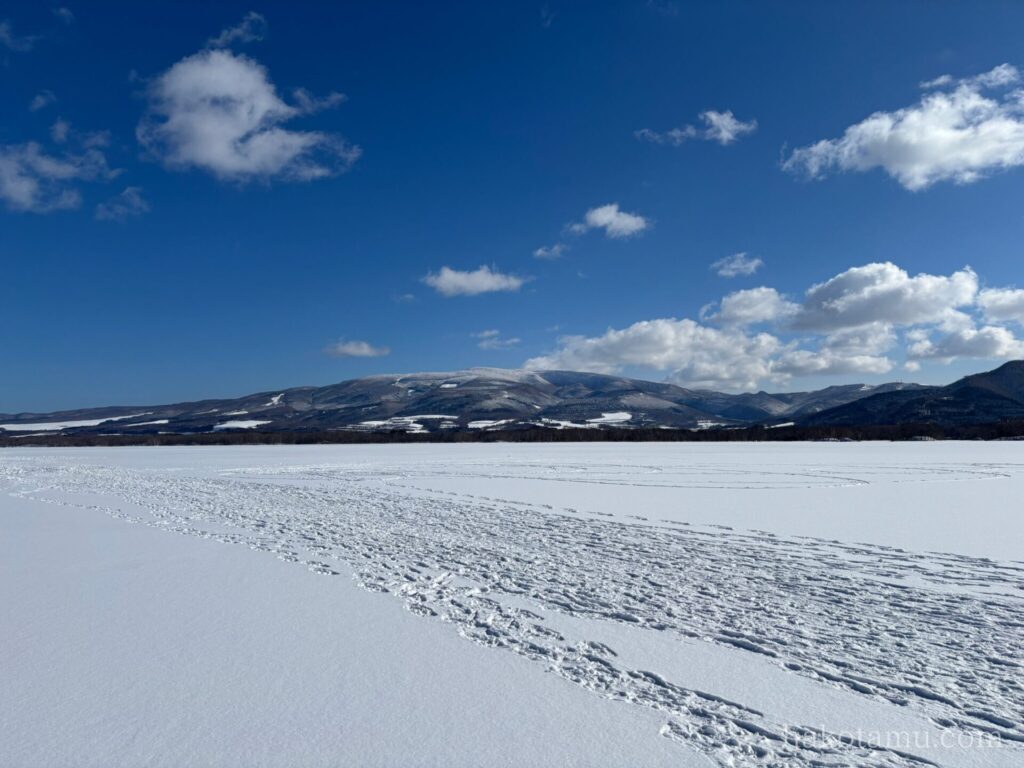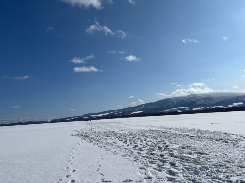 森の中を散策するのも良いですが、とても気温が下がる2月ごろは大沼が凍るため湖上も歩くことができるとのことで、行ってみました🧊この写真、沼の上です!大沼一面が厚い氷で覆われています。