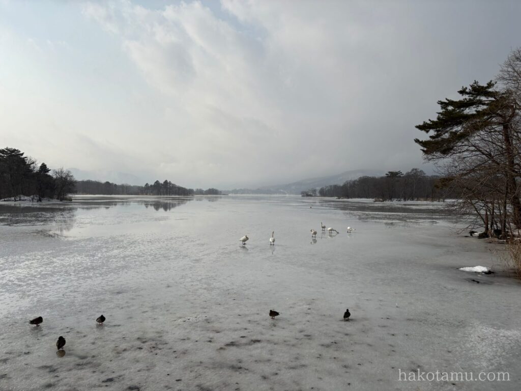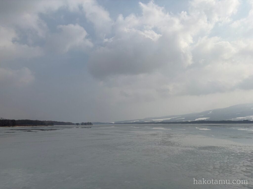 筆者、別の日にも行ってみました!こちら、大沼の上です。前回とはうって変わり、雪はすっかりなくなり氷が張っていないように見えますが、一応まだ湖上に立つことができました。
