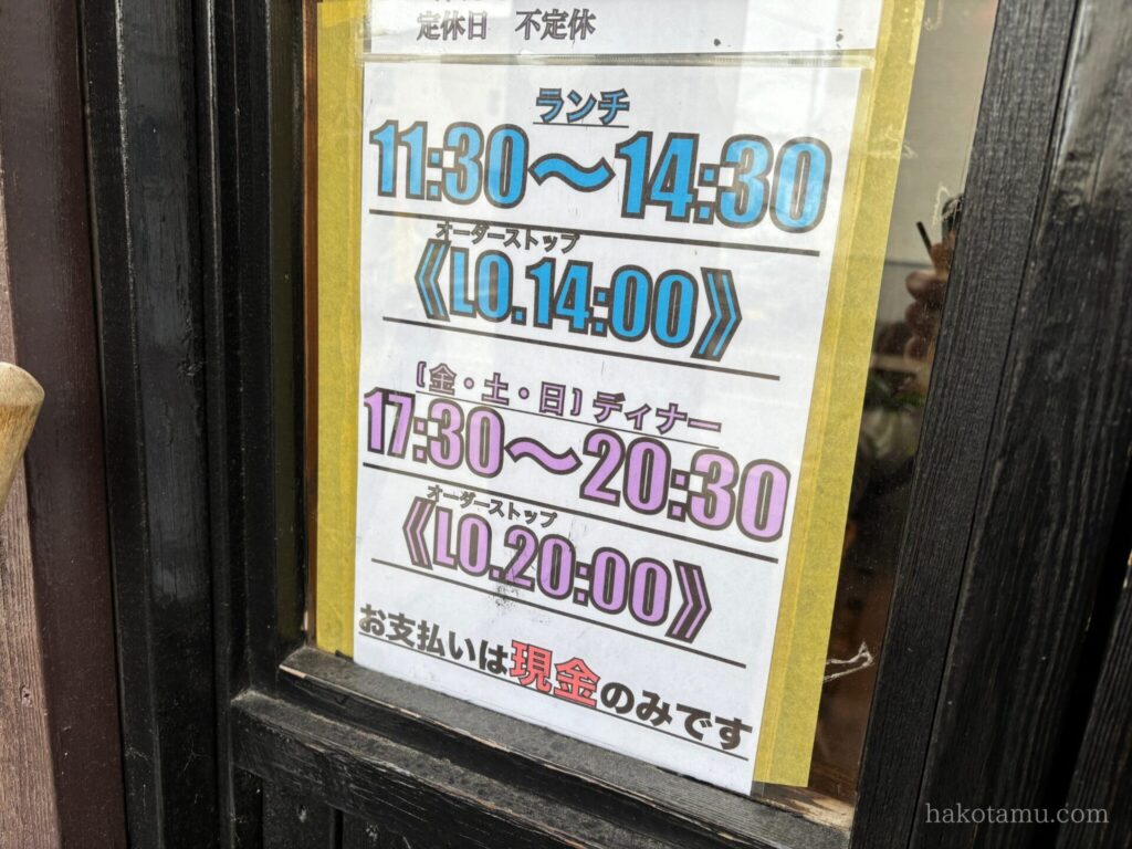 | 営業時間 | ランチ 11:30~14:30 ディナー 17:30~20:30(2026年2月時点ではランチ営業のみとのこと) ※スープがなくなり次第終了 |
