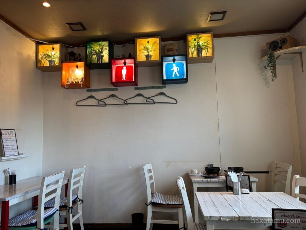 座席はカウンター?2席、2人席✖️4つ程度、4人席✖️1つだったと思います!ちょっと面白いインテリアが飾られていました🚥