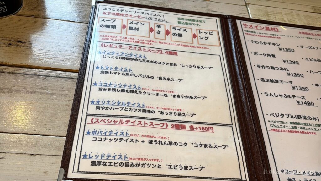 チャーリースパイスさん的オーダーの流れが記載されていますので、これに沿ってオリジナルスープカレーを注文します✨スープは全部で6種類、それぞれに特徴があるのでお好みのものをチョイスします👀