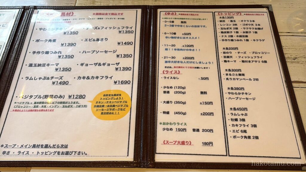 その次はメインの具材を選びます!ここで基本的な価格が決定します💲お肉や魚介、野菜などが用意されています🥗あとは辛さとライスの量を選び、トッピングはお好みでどうぞ🎶