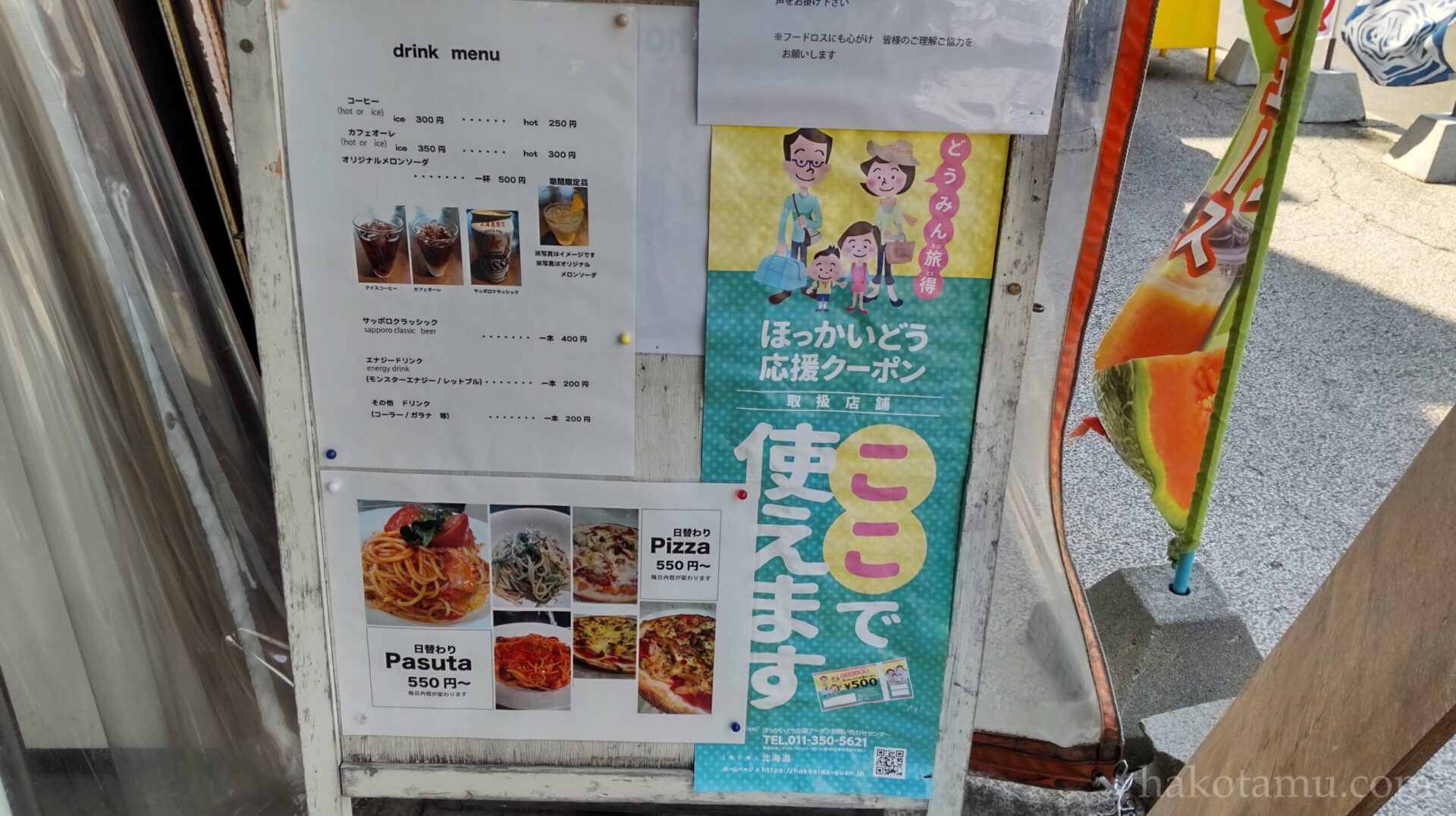 店先にはメロンのかき氷のお知らせが。大きくカットされた赤肉メロンが沢山のったかき氷。瑞々しくおいしそうです。コーヒー等のカフェメニューやサッポロクラシック等のアルコールがあり、ピザやパスタなんかも550円~と安価に提供してくれているようでした。